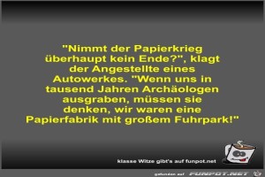 | Nimmt der Papierkrieg überhaupt kein Ende? Bild (37.81 KB) 7Lustiges → klasse Sprüche und Witze | Lustiges → klasse Sprüche und Witze | 01.12.20-08:05 | Fossy | |