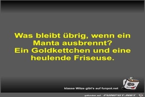 | Was bleibt übrig, wenn ein Manta ausbrennt? Bild (28.24 KB) 12Lustiges → klasse Sprüche und Witze | Lustiges → klasse Sprüche und Witze | 02.12.20-08:00 | Fossy | |