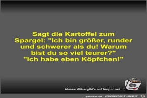 | Sagt die Kartoffel zum Spargel Bild (31.52 KB) 15Lustiges → klasse Sprüche und Witze | Lustiges → klasse Sprüche und Witze | 01.12.20-13:55 | Fossy | |