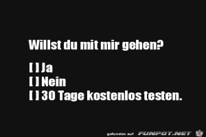 | Willst du mit mir gehen? Bild (17.61 KB) 13Lustiges → klasse Sprüche und Witze | Lustiges → klasse Sprüche und Witze | 01.12.20-07:45 | Aisha | |