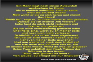 | Ein Mann liegt nach einem Autounfall wochenlang im Koma Bild (83.36 KB) 4Lustiges → klasse Sprüche und Witze | Lustiges → klasse Sprüche und Witze | 03.04.-18:22 | Fossy | |