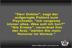 | "Herr Doktor", sagt der aufgeregte Patient zum Psychiater, Bild (37.57 KB) 3Lustiges → klasse Sprüche und Witze | Lustiges → klasse Sprüche und Witze | 03.04.-10:18 | Fossy | |
