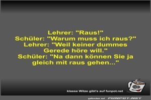 | Lehrer: "Raus!" Bild (31.12 KB) 3Lustiges → klasse Sprüche und Witze | Lustiges → klasse Sprüche und Witze | 19.03.-09:16 | Fossy | |