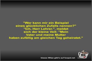 | Wer kann mir ein Beispiel eines glücklichen Zufalls nennen? Bild (28.36 KB) 1Lustiges → klasse Sprüche und Witze | Lustiges → klasse Sprüche und Witze | 30.09.-14:01 | Fossy | |