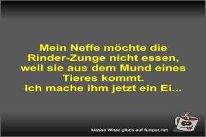 | Mein Neffe möchte die Rinder-Zunge nicht essen Bild (30.67 KB) 4Lustiges → klasse Sprüche und Witze | Lustiges → klasse Sprüche und Witze | 29.09.-17:57 | Fossy | |