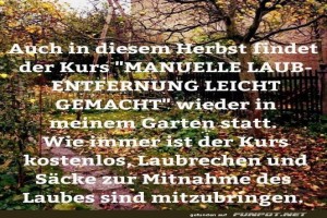 | Herbst-Abenteuer: Laubentfernung 101 Bild (207.68 KB) 8Lustiges → klasse Sprüche und Witze | Lustiges → klasse Sprüche und Witze | 30.09.-09:47 | ||