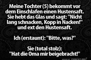 | Hustensaft-Hero: Oma bildet Profis aus! Bild (151.85 KB) 2Lustiges → klasse Sprüche und Witze | Lustiges → klasse Sprüche und Witze | 28.09.-13:59 | Schneeflittchen | |
