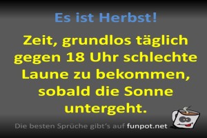 | Herbst: Wenn die Sonne schlechte Laune bringt Bild (83.63 KB) 4Lustiges → klasse Sprüche und Witze Auf mich trifft das definitiv zu, da ich die dunklen Jahreszeiten noch nie mochte :-) | Lustiges → klasse Sprüche und Witze | 30.09.-11:15 | ||