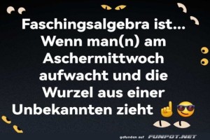 | Faschingsalgebra: Humor nach Aschermittwoch Bild (62.41 KB) 9Lustiges → klasse Sprüche und Witze | Lustiges → klasse Sprüche und Witze | 04.03.-09:01 | Valentin | |