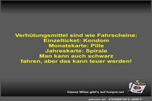| Verhütungsmittel sind wie Fahrscheine Bild (28.6 KB) 4Lustiges → klasse Sprüche und Witze | Lustiges → klasse Sprüche und Witze | 04.03.-10:19 | Fossy | |