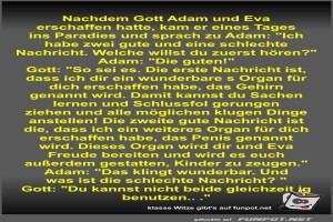 | Nachdem Gott Adam und Eva erschaffen hatte Bild (102.45 KB) 3Lustiges → klasse Sprüche und Witze | Lustiges → klasse Sprüche und Witze | 28.02.-11:02 | Fossy | |