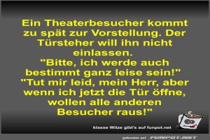 | Ein Theaterbesucher kommt zu spät zur Vorstellung Bild (49.08 KB) 4Lustiges → klasse Sprüche und Witze | Lustiges → klasse Sprüche und Witze | 27.02.-10:19 | Fossy | |