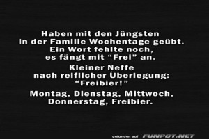| Witz über Wochentage mit Kind Bild (48.36 KB) 5Lustiges → klasse Sprüche und Witze | Lustiges → klasse Sprüche und Witze | 02.03.-08:35 | Celina93 | |