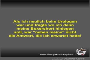 | Als ich neulich beim Urologen war und fragte wo ich denn... Bild (30.17 KB) 2Lustiges → klasse Sprüche und Witze | Lustiges → klasse Sprüche und Witze | 27.02.-17:10 | Fossy | |