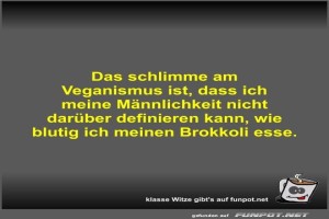 | Das schlimme am Veganismus ist Bild (30.8 KB) 2Lustiges → klasse Sprüche und Witze | Lustiges → klasse Sprüche und Witze | 01.03.-16:45 | Fossy | |