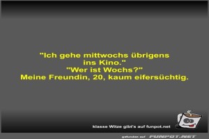 | Ich gehe mittwochs übrigens ins Kino Bild (21.38 KB) 2Lustiges → klasse Sprüche und Witze | Lustiges → klasse Sprüche und Witze | 27.02.-13:17 | Fossy | |