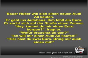 | Bauer Huber will sich einen neuen Audi A8 kaufen Bild (45.41 KB) 3Lustiges → klasse Sprüche und Witze | Lustiges → klasse Sprüche und Witze | 01.03.-11:48 | Fossy | |