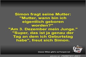 | Simon fragt seine Mutter Bild (38.84 KB) 1Lustiges → klasse Sprüche und Witze | Lustiges → klasse Sprüche und Witze | 26.02.-12:30 | Fossy | |