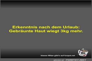 | Erkenntnis nach dem Urlaub: Gebräunte Haut wiegt 3kg mehr. Bild (20.08 KB) 2Lustiges → klasse Sprüche und Witze | Lustiges → klasse Sprüche und Witze | 07.02.-14:44 | Fossy | |