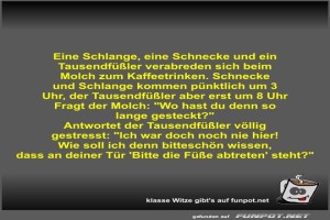| Eine Schlange, eine Schnecke und ein Tausendfüßler... Bild (47.58 KB) 6Lustiges → klasse Sprüche und Witze | Lustiges → klasse Sprüche und Witze | 09.01.-10:07 | Fossy | |