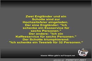 | Zwei Engländer und ein Schotte sind zur Hochzeitsfeier... Bild (34.33 KB) 2Lustiges → klasse Sprüche und Witze | Lustiges → klasse Sprüche und Witze | 07.01.-17:54 | Fossy | |