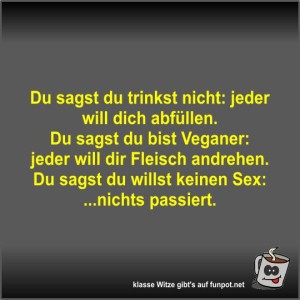 Wer kennt sie nicht - lustige Sprüche und Witze in Bildformat! Einen frechen Spruch haben viele Leute auf den Lippen. Aber diesen kurz und knapp mit Pepp und Humor aufzuschreiben, das ist die Kunst hinter diesen witzigen Spruchbildern. Es ist immer wieder faszinierend, dass hier täglich neue lustige Sprüche und Witze dazu kommen. Jeder Tag bietet natürlich auch immer wieder Situationen, die einen schon quasi zu einem frechen Spruch nötigen.