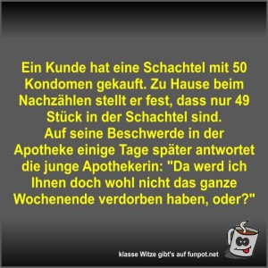 Du hast auch lustige Sprüche oder kurze Witze auf Lager? Dann kannst du diese hier auf funpot über den Bildgenerator einstellen. Denk aber immer daran, dass dein Spruch oder Witz kurz und knackig sein soll und außerdem lustig sein muss. Denn Langeweile wollen wir hier auf keinen Fall aufkommen lassen.![]() | ![]() Datenschutz HinweisWir haben absichtlich nicht die "normalen" Like-Buttons verwendet, da durch diese Buttons schon beim Laden der Seite – also ganz ohne dass der Anwender etwas dazu tut – Daten an die Betreiber der Netzwerkplattformen übertragen werden. Hier surfst du anonym! Doch mit einem Klick auf diese Buttons gelangst du zu den jeweiligen sozialen Netzwerken und wir haben keinen Einfluss auf den Umfang der Daten, die dort erhoben und gesammelt werden. | ![]() |