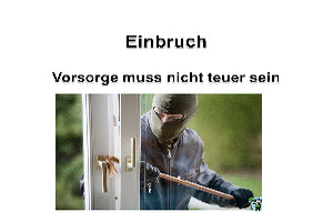 | Einbruch Vorsorge muss nicht teuer sein Powerpoint (10.35 MB) 36Lustiges → Wissenswertes Eine hervorragende Präsentation zum Thema Einbruch-Schutz. Bei Freunden von uns wurde tatsächlich an Weihnachten eingebrochen und nun haben sie sämtliche Fenster einbruchsicher machen lassen. Kostet zwar einen Haufen Geld, aber das ist es einem wert, wenn mal fremde Leute deine Sachen durchwühlt haben. | Lustiges → Wissenswertes | 13.06.-23:09 | lucky | |