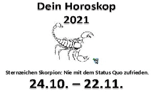| 11. Dein Horoskop Skorpion 2021 Powerpoint (2.95 MB) 13Lustiges → Wissenswertes Am 24.10. beginnt das Sternzeichen Skorpion. Über Menschen mit dem Sternzeichen Skorpion darf ich nichts Negatives sagen, da meine Mutter und unsere Neffen Skorpione sind. Aber dass sie einen Stachel haben, darf man erwähnen ;-) | Lustiges → Wissenswertes | 21.10.21-00:00 | lucky | |