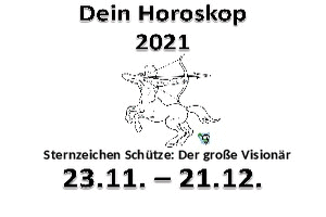 | 12. Dein Horoskop Schütze 2021 Powerpoint (2.86 MB) 12Lustiges → Wissenswertes Am 23.11. beginnt das Sternzeichen Schütze. Wenn du Schütze bist und ein bisschen was über dich lernen willst, schau doch gleich mal rein ;-) | Lustiges → Wissenswertes | 20.11.21-00:00 | lucky | |