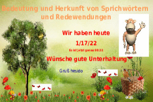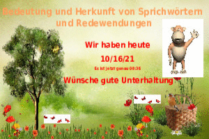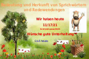 | Sprichwörter & Redewendungen Powerpoint (2.67 MB) 47Lustiges → Wissenswertes → Redensarten Die Redewendungen sind erfahrenswert, schau sie dir an, da machst du nichts verkehrt. | Lustiges → Wissenswertes → Redensarten | 16.10.21-08:38 | hesido | |