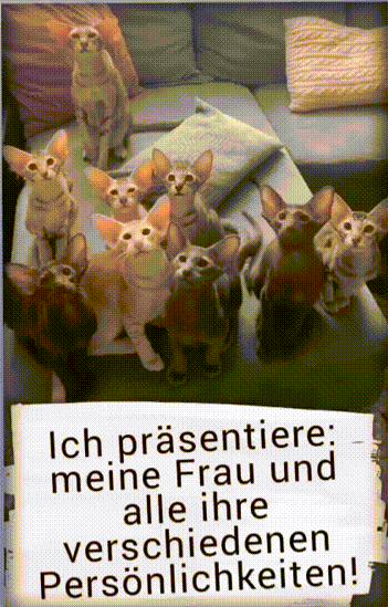 | Verschiedene Persönlichkeiten Bild (3.63 MB) 4Lustiges → witzige Bilder → animierte Bilder und lustige Katzen | Lustiges → witzige Bilder → animierte Bilder und lustige Katzen | 13.04.-14:23 | ||