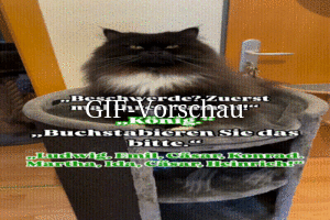 | Ihren Namen zuerst Bild (5.14 MB) 3Lustiges → witzige Bilder → animierte Bilder und lustige Katzen | Lustiges → witzige Bilder → animierte Bilder und lustige Katzen | 12.02.-19:45 | Louisa2002 | |