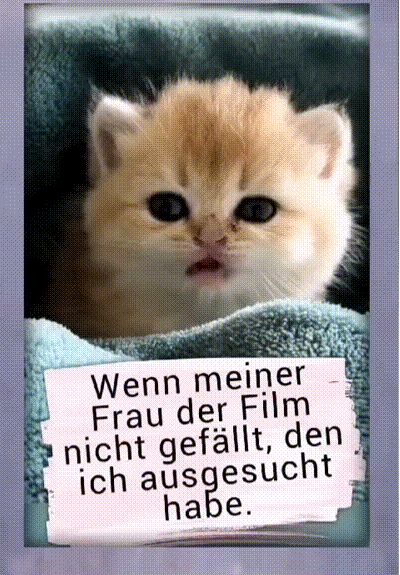 | Blöder Film Bild (2.39 MB) 2Lustiges → witzige Bilder → animierte Bilder und lustige Katzen | Lustiges → witzige Bilder → animierte Bilder und lustige Katzen | 13.10.24-09:07 | Valerie-1976 | |