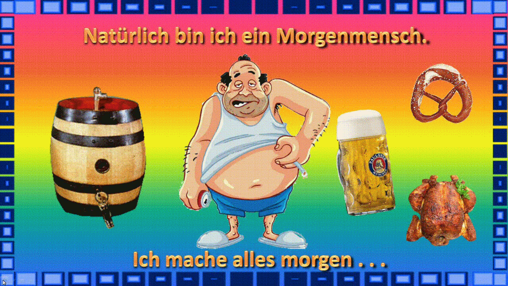 | Morgenmensch Bild (6.3 MB) 22Lustiges → witzige Bilder → animierte Bilder | Lustiges → witzige Bilder → animierte Bilder | 16.10.24-08:07 | hesido | |
