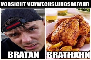| Vorsicht Verwechslungsgefahr: Bratan Brathahn Bild (157.39 KB) Lustiges → witzige Bilder → Verwechslungsgefahren Bratan bedeutet „Bruder“, „Freund“ oder „Kumpel“. | Lustiges → witzige Bilder → Verwechslungsgefahren | 22.06.-20:46 | Hektor | ||