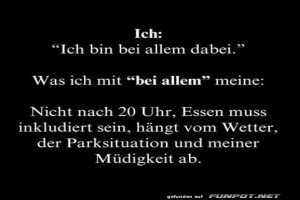 | "Ich bin bei allem dabei" mit Bedingungen Bild (39.5 KB) 4Lustiges → klasse Sprüche und Witze | Lustiges → klasse Sprüche und Witze | 21.03.-12:00 | ||
