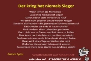 | Der Krieg hat niemals Sieger Bild (22.93 KB) 2Herziges → Nachdenkliches und Gedichte | Herziges → Nachdenkliches und Gedichte | 30.03.22-14:21 | ||