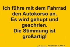 |  7 |       | Autokorso mit dem Rad anführen Bild (49.09 KB)  7 Lustiges → klasse Sprüche und Witze | Lustiges → klasse Sprüche und Witze | 17.11.24-20:03 | ||