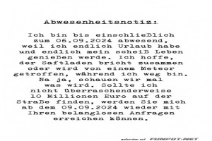 | Abwesenheitsnotiz Bild (90.07 KB) 5Lustiges → klasse Sprüche und Witze | Lustiges → klasse Sprüche und Witze | 27.08.24-10:54 | ||