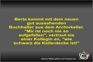 1 | ![]() ![]() ![]() | Berta kommt mit dem neuen gut aussehenden Buchhalter aus... Bild (34.36 KB) 1Lustiges → klasse Sprüche und Witze | Lustiges → klasse Sprüche und Witze | 08.12.-13:47 | Fossy | |