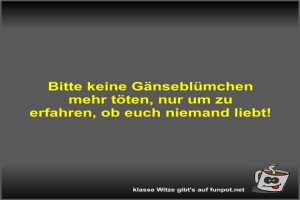 3 | ![]() ![]() ![]() | Bitte keine Gänseblümchen mehr töten Bild (22.64 KB) 3Lustiges → klasse Sprüche und Witze | Lustiges → klasse Sprüche und Witze | 08.12.-19:04 | Fossy | |