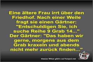 1 | ![]() ![]() ![]() | Eine ältere Frau irrt über den Friedhof Bild (50.58 KB) 1Lustiges → klasse Sprüche und Witze | Lustiges → klasse Sprüche und Witze | heute-12:15 | Fossy | |