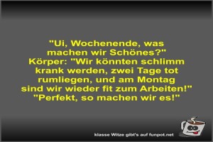 ![]() ![]() ![]() | Ui, Wochenende, was machen wir Schönes? Bild (38.06 KB) von Fossy am 12. Dezember 2025 um 10:23 Uhr Lustiges → klasse Sprüche und Witze | Lustiges → klasse Sprüche und Witze | heute-10:23 | Fossy | ||