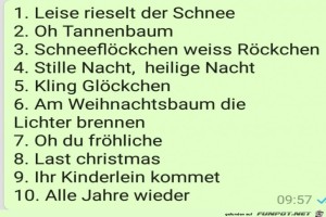 | Auflösung des Weihnachtslieder-Rätsels Bild (86.35 KB) 11Lustiges → klasse Sprüche und Witze Ich hoffe, ihr hattet Spaß beim Erraten der Weihanchtslieder in der Mail vom Montag 14.12.2020. Link zum Rätsel-Bild Die Nr. 5 müsste allerdings "süsser die Glocken nie klingen" sein (das hat dem Fossy einer Leser geschrieben) ;-) | Lustiges → klasse Sprüche und Witze | 14.12.20-19:32 | ||