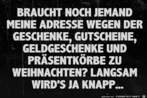 | Braucht jemand meine Adresse? Bild (87.65 KB) 3Lustiges → klasse Sprüche und Witze | Lustiges → klasse Sprüche und Witze | 20.12.21-20:01 | ||