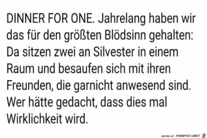 | Dinner for one Bild (58.92 KB) 2Lustiges → klasse Sprüche und Witze und Corona | Lustiges → klasse Sprüche und Witze und Corona | 03.01.21-20:57 | ||