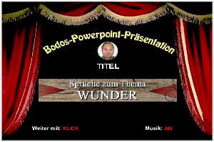 | WUNDER-Sprüche zum Thema Powerpoint (7.25 MB) 10Herziges → Sprüche Wunder gibt es immer wieder, auch wenn man in manchen Zeiten den Glauben daran verlieren könnte. | Herziges → Sprüche | 20.01.22-16:28 | ||