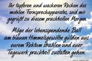 | Guten Morgen Bild (499.71 KB) 1Lustiges → klasse Sprüche und Witze | Lustiges → klasse Sprüche und Witze | 09.05.24-21:49 | ||