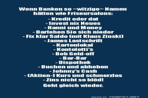 | Lustige Namen für Banken Bild (129.4 KB) 2Lustiges → klasse Sprüche und Witze | Lustiges → klasse Sprüche und Witze | 14.07.24-09:14 | ||